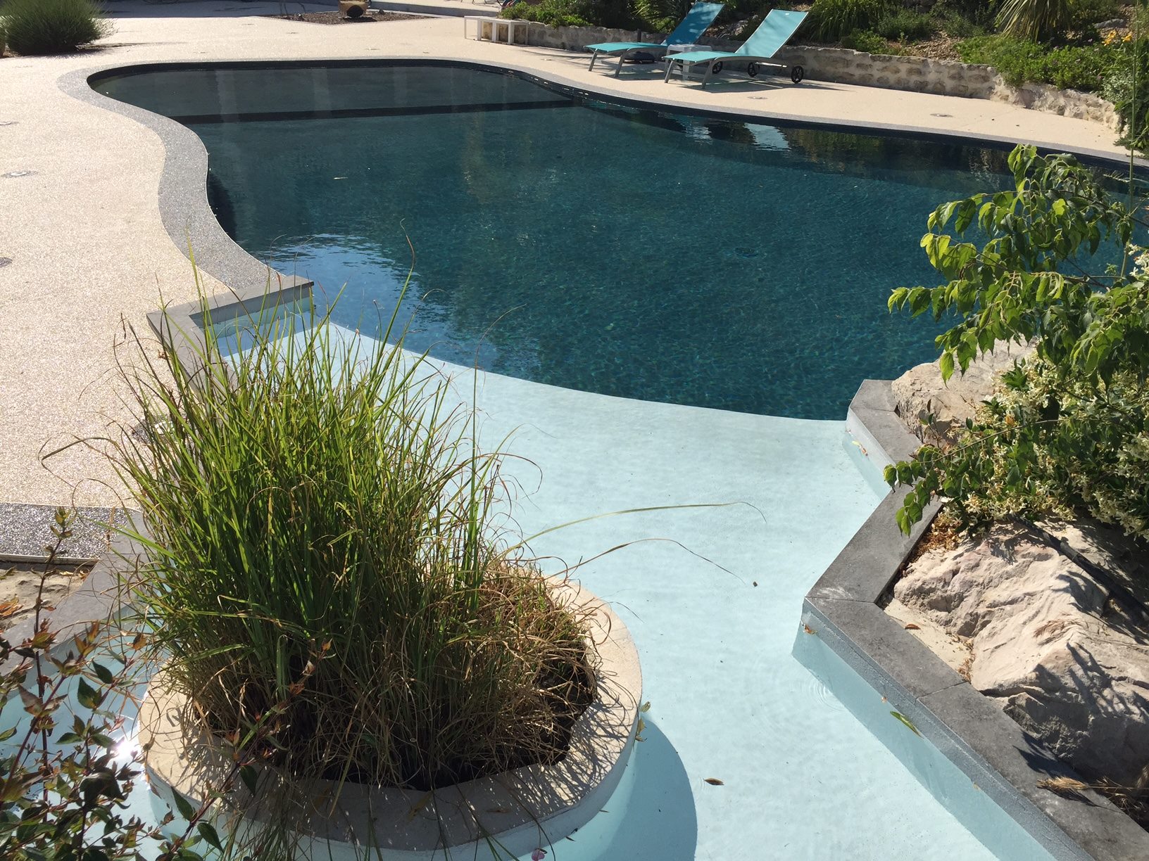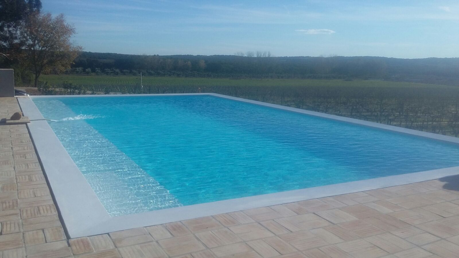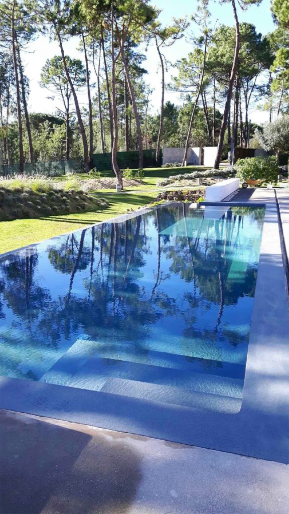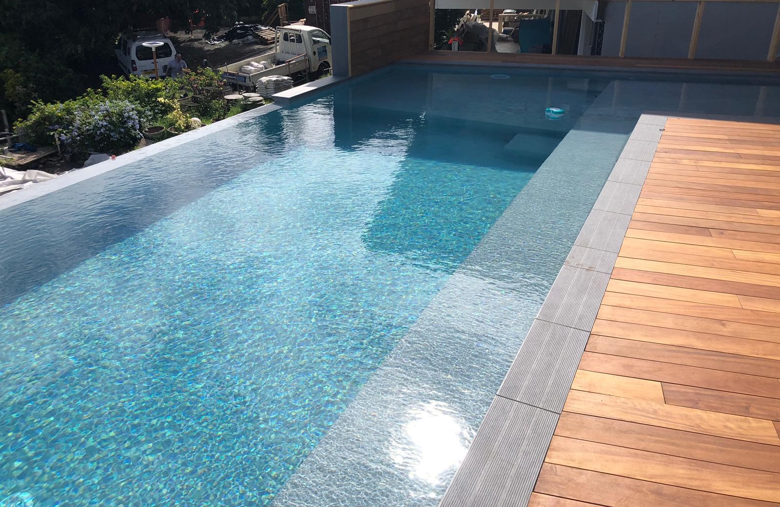 Type de piscine conçu pour donner l’illusion que la piscine fait partie intégrante du paysage environnant. La hauteur d’au moins un des cotés est plus basse que les autres. Une lame d’eau de 3 millimètres se déverse dans un bac en contre bas de la piscine.